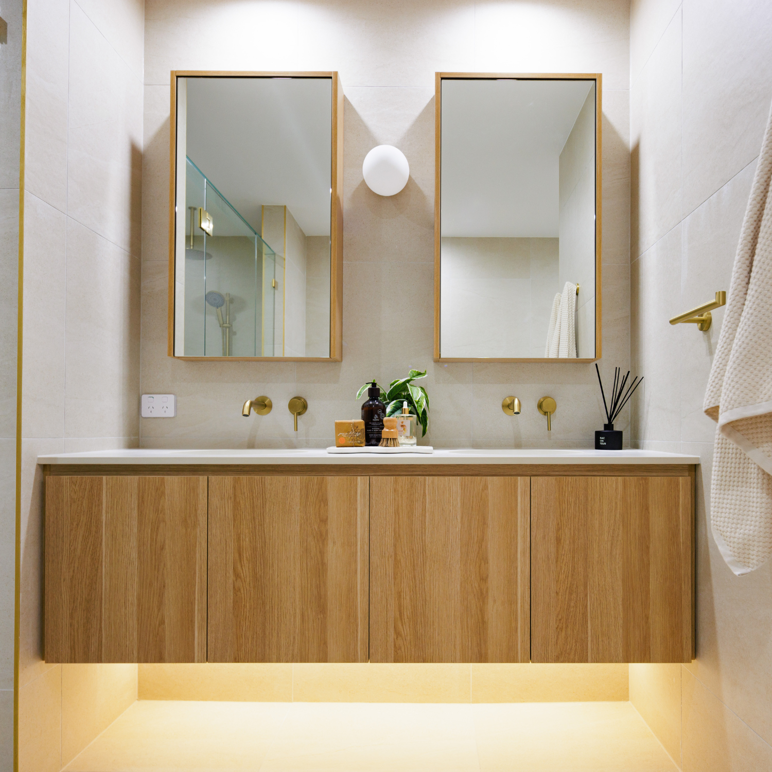 Designed to order with premium stone tops, timber grain cabinetry, and integrated basins.